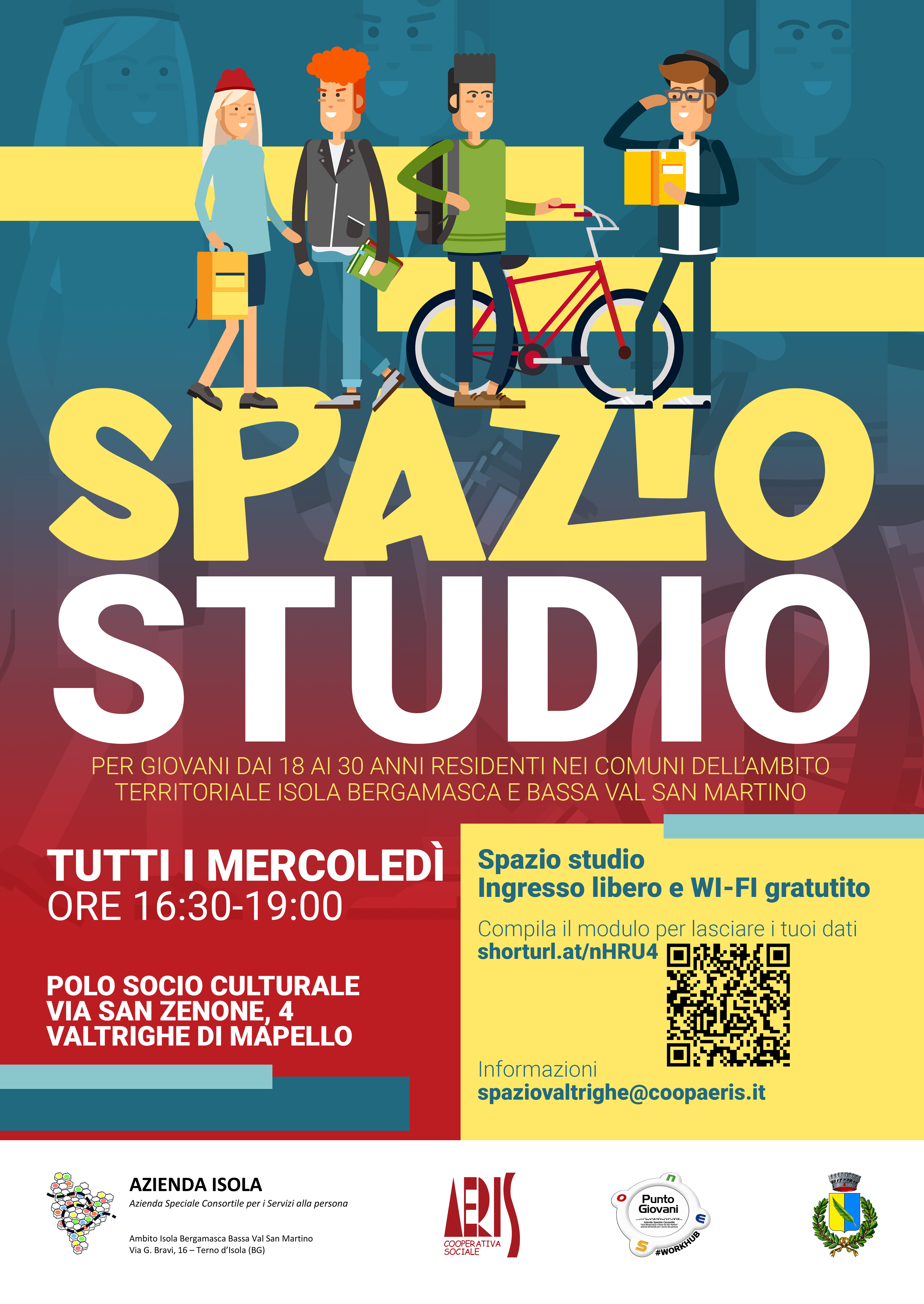 Per tutti i ragazzi dai 18 ai 30 anni residenti nell’Isola Bergamasca e Bassa San Martino è attivo lo Spazio Studio presso il Polo Socio Culturale a Valtrighe di Mappello - via San Zenone 4, tutti i mercoledì dalle 16:30 alle 19:00.